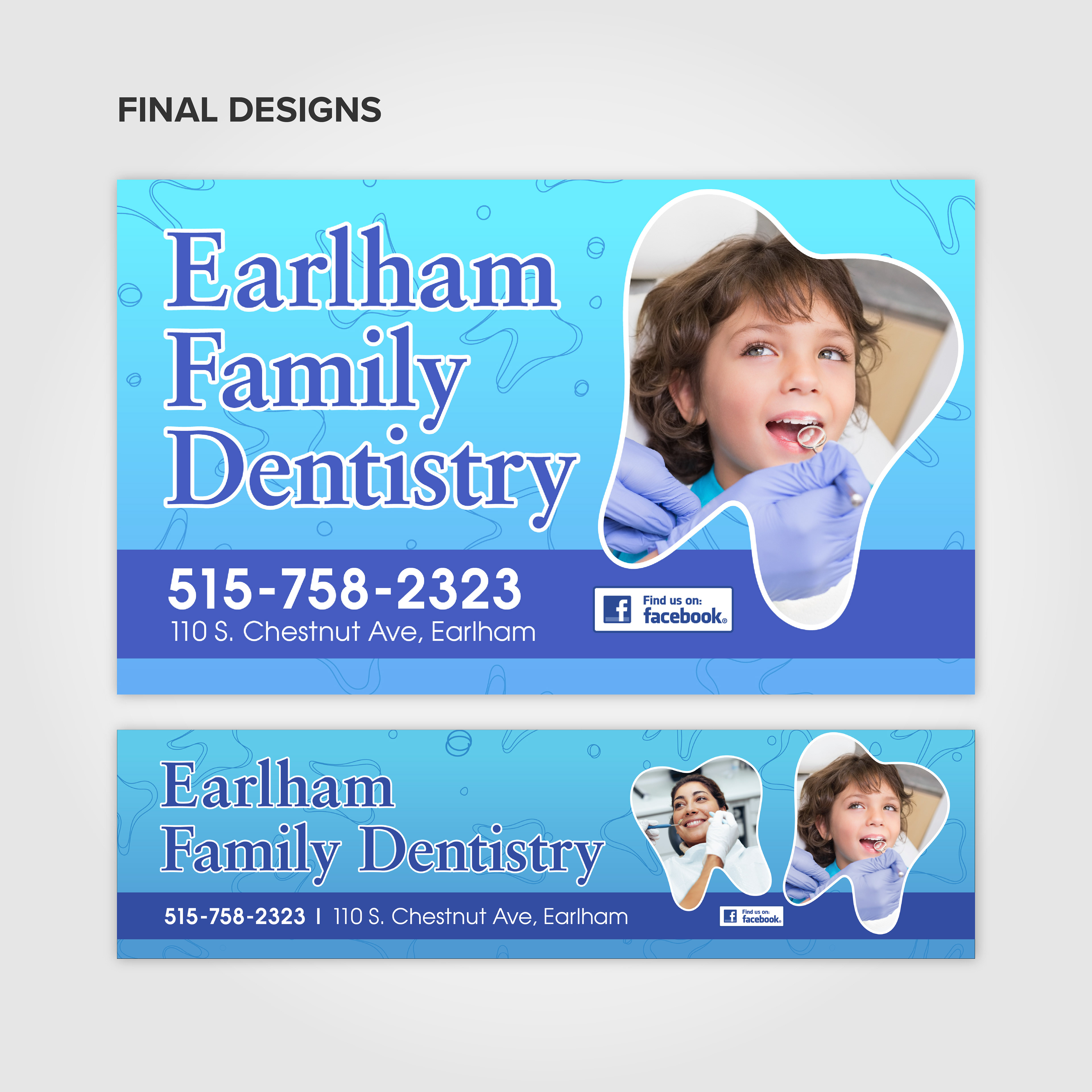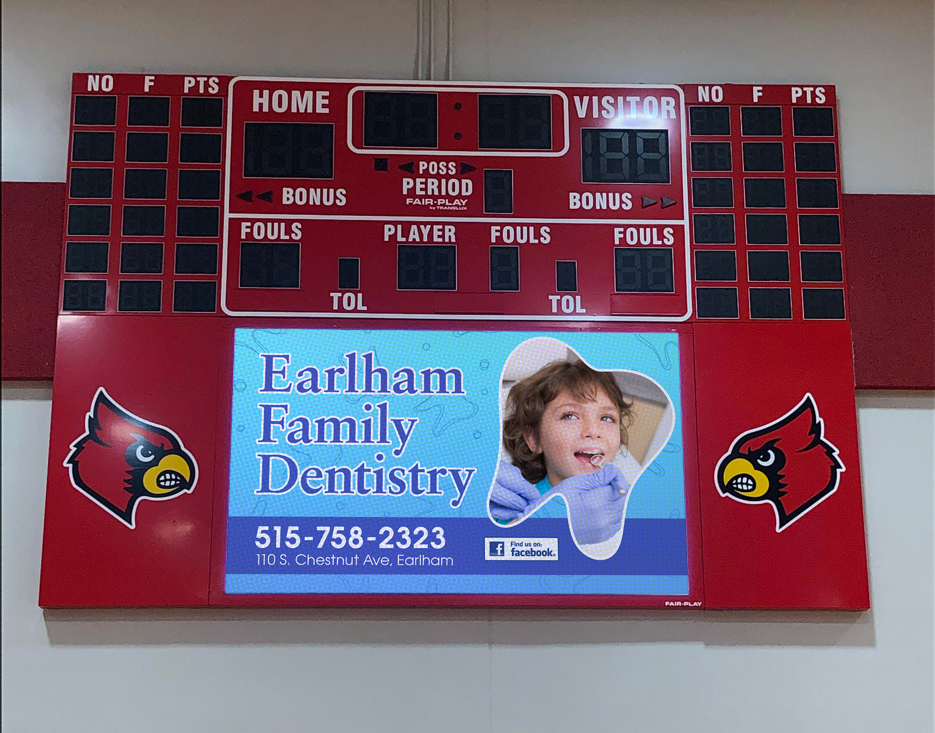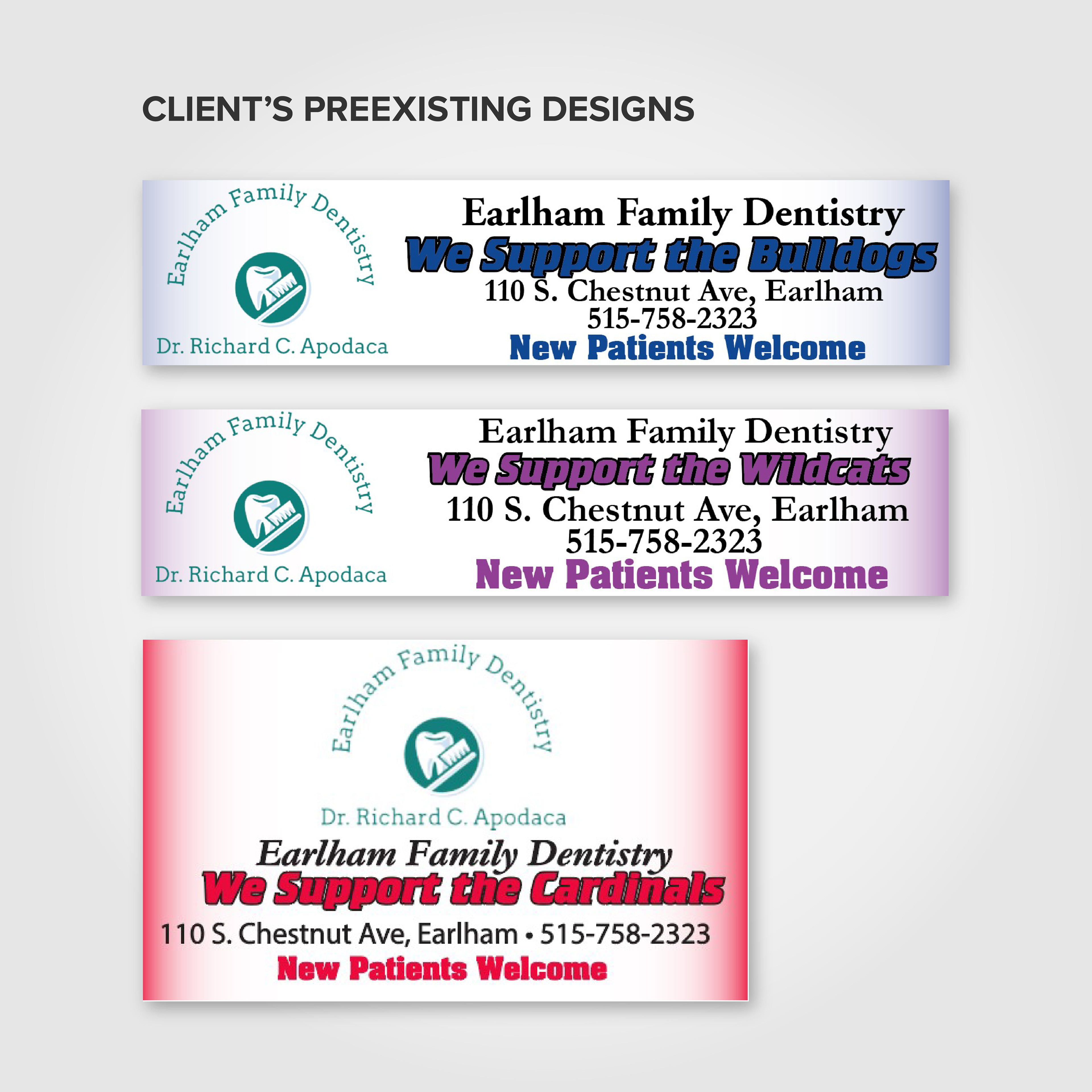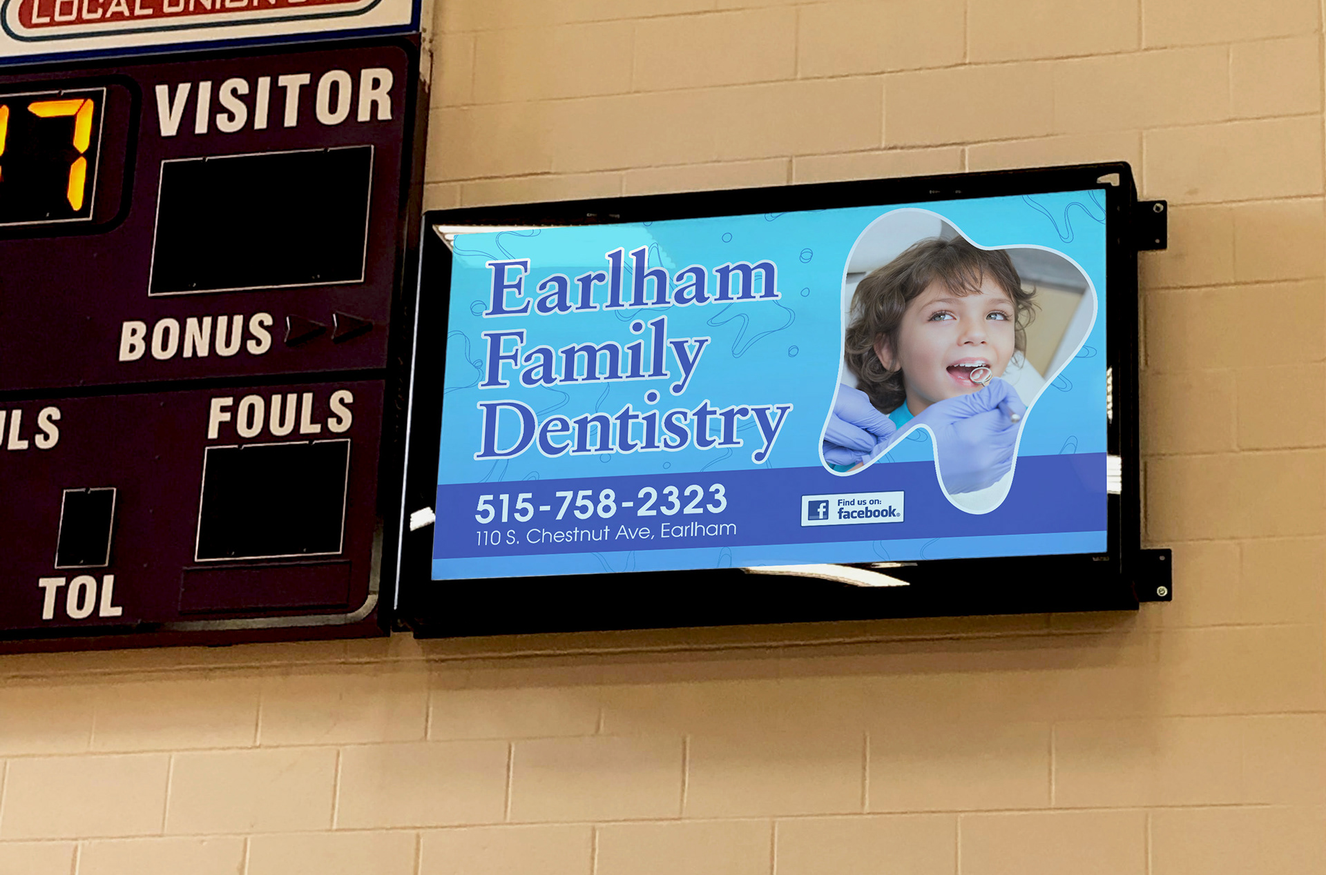 Earlham Family Dentistry is a dental practice located in Earlham, Iowa. They wanted to have artwork updated for their advertisements at several school gymnasiums and requested that their logo be removed since they were no longer using it. I suggested that we give the design an overhaul (the original designs are above). Their previous designs had a lot of copy on them that would make them difficult to read from the stands across the gym. I recommended reducing the copy to the essentials: business name, number, and address. They requested that “Find us on Facebook” be included. I chose a cool color palette to have the association with “fresh” that goes well with dentists, as well as a teeth-inspired background to continue the motif. Using predominantly a rule of thirds grid, I also included some stock images of dental patients to help the viewer connect with the business on a more personal level. This design was displayed in three school gyms: on an LED screen, on an LCD screen, and on a printed backlit table. I adjusted the coloring for the backlit table to ensure that ink levels would remain consistent during printing and that the final product would still allow light to pass through.