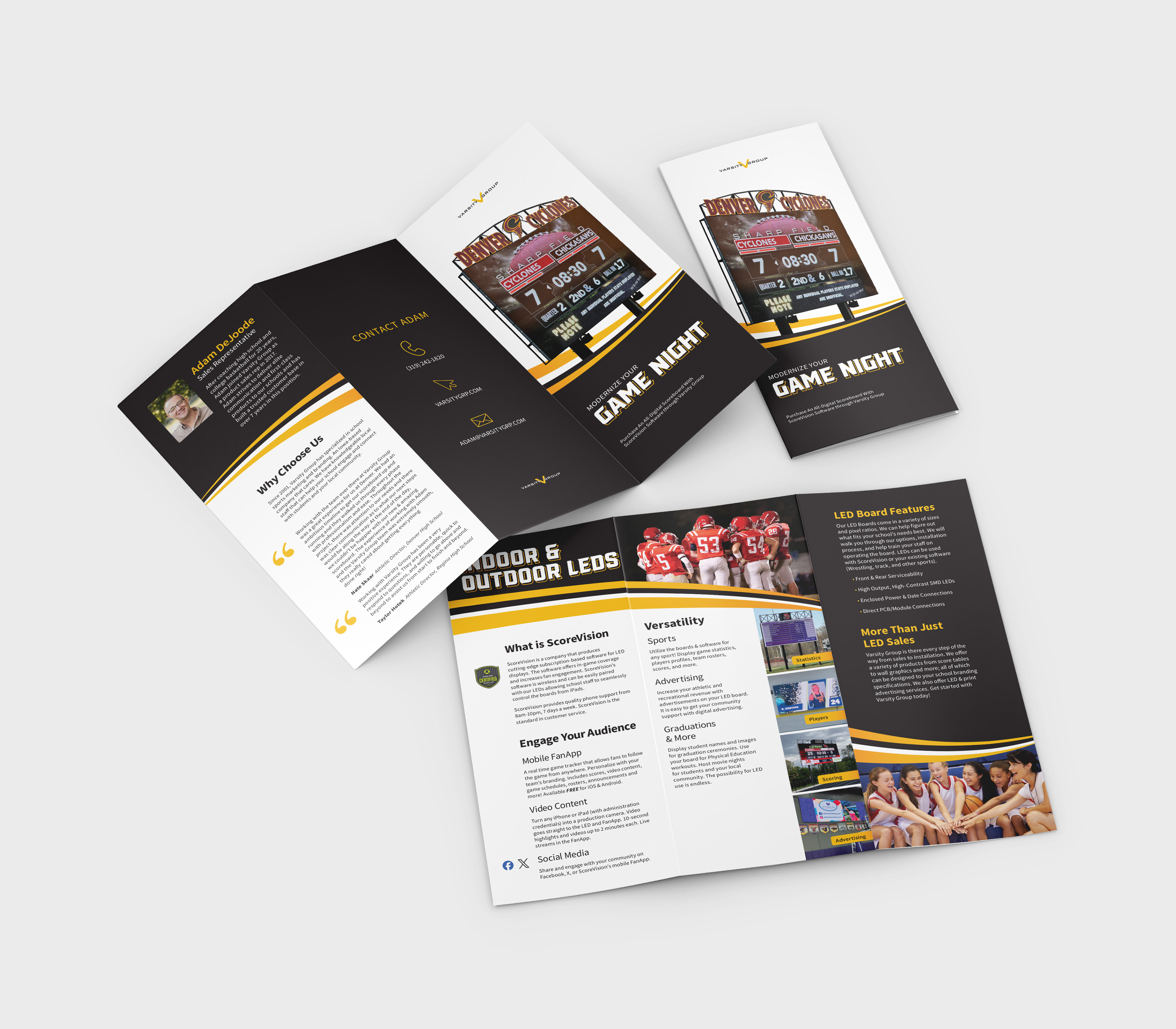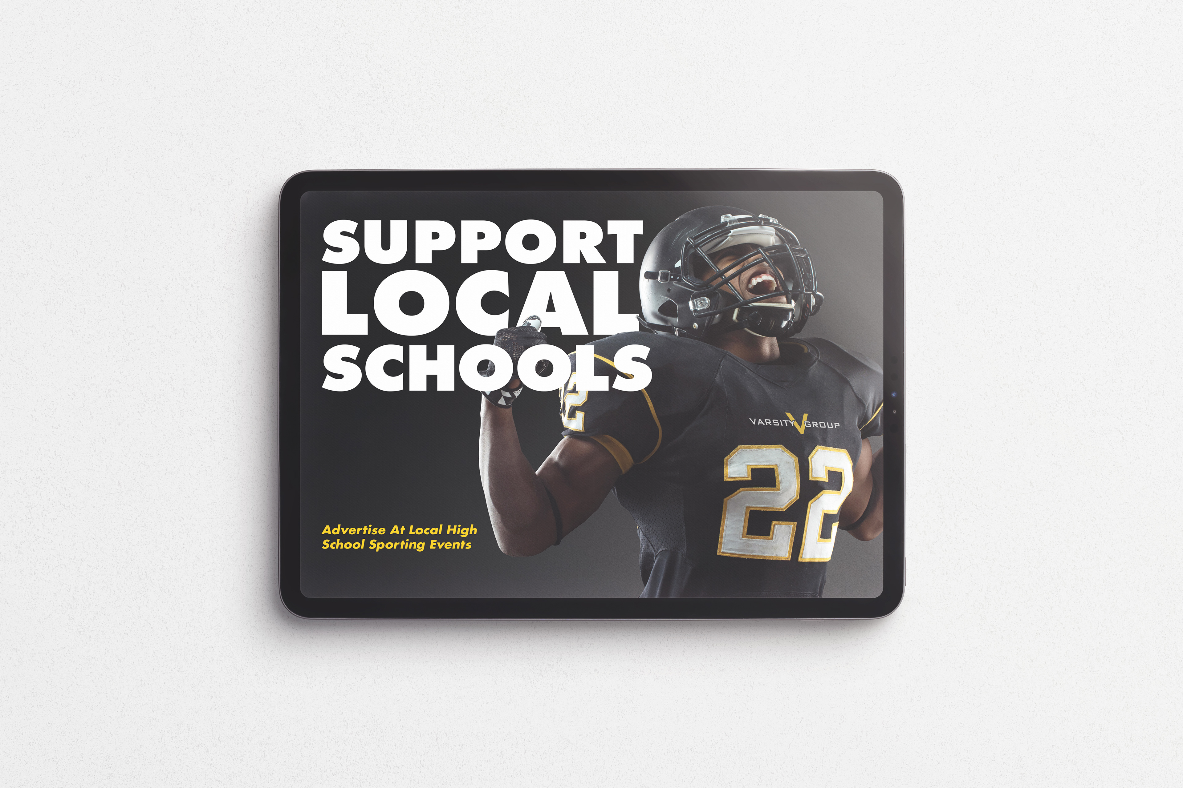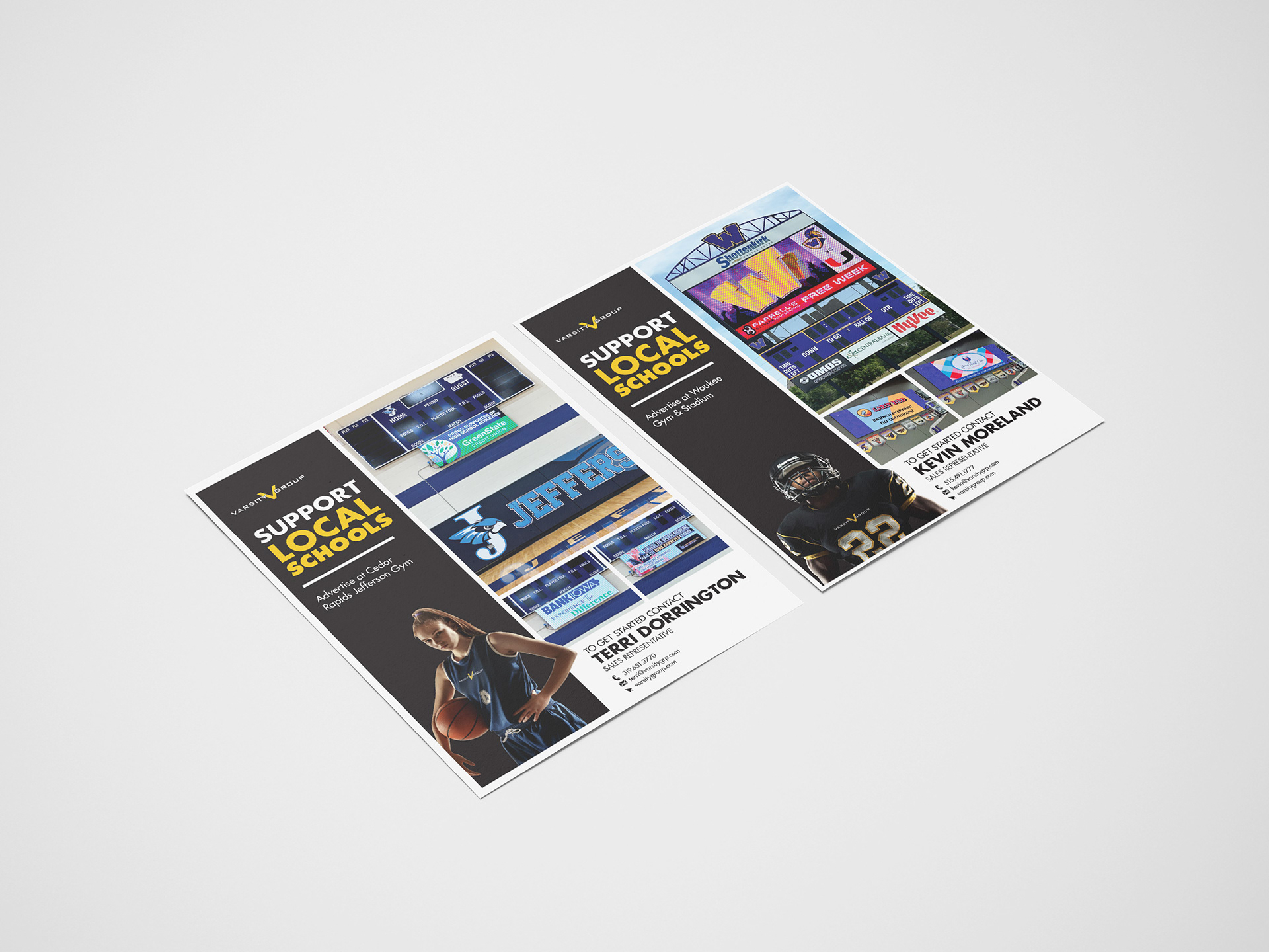 Varsity Group is an advertising and marketing company based in Des Moines, Iowa. They sell advertising space at high school gyms and stadiums across the Midwest. Varsity also offers many different products that can be customized for schools’ athletic departments. During my time as the sole graphic designer for Varsity Group, I created a variety of promotional materials. These included flyers, brochures, business cards, digital presentations, and LED advertising slides. Using the existing logo and branding colors, I kept a consistent sporty yet clean feel across all the designs. Using bold serif fonts paired with dark backgrounds and eye-catching images of adolescent athletes, the designs produced a modern look while connecting viewers with their local high school athletics teams.